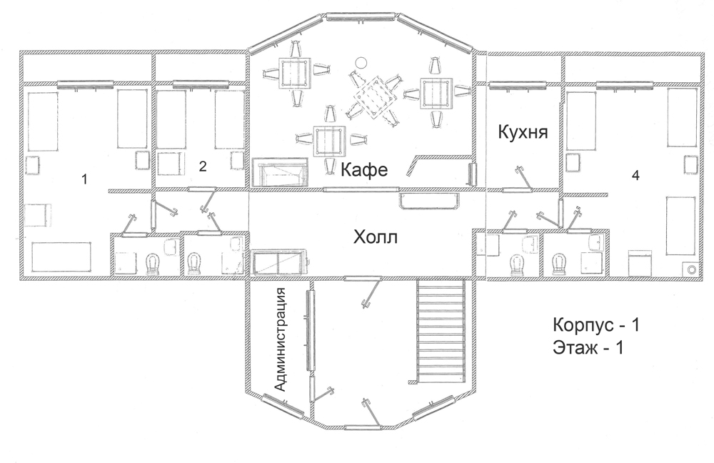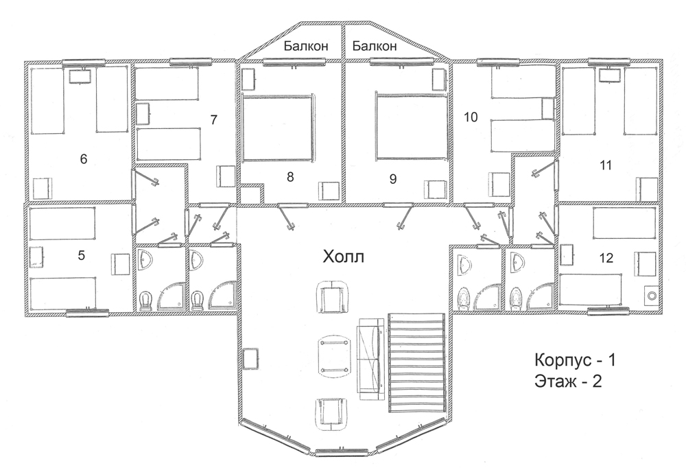 1.Благоустроенный двухэтажный корпус (номера 2-х и 3-х местные)